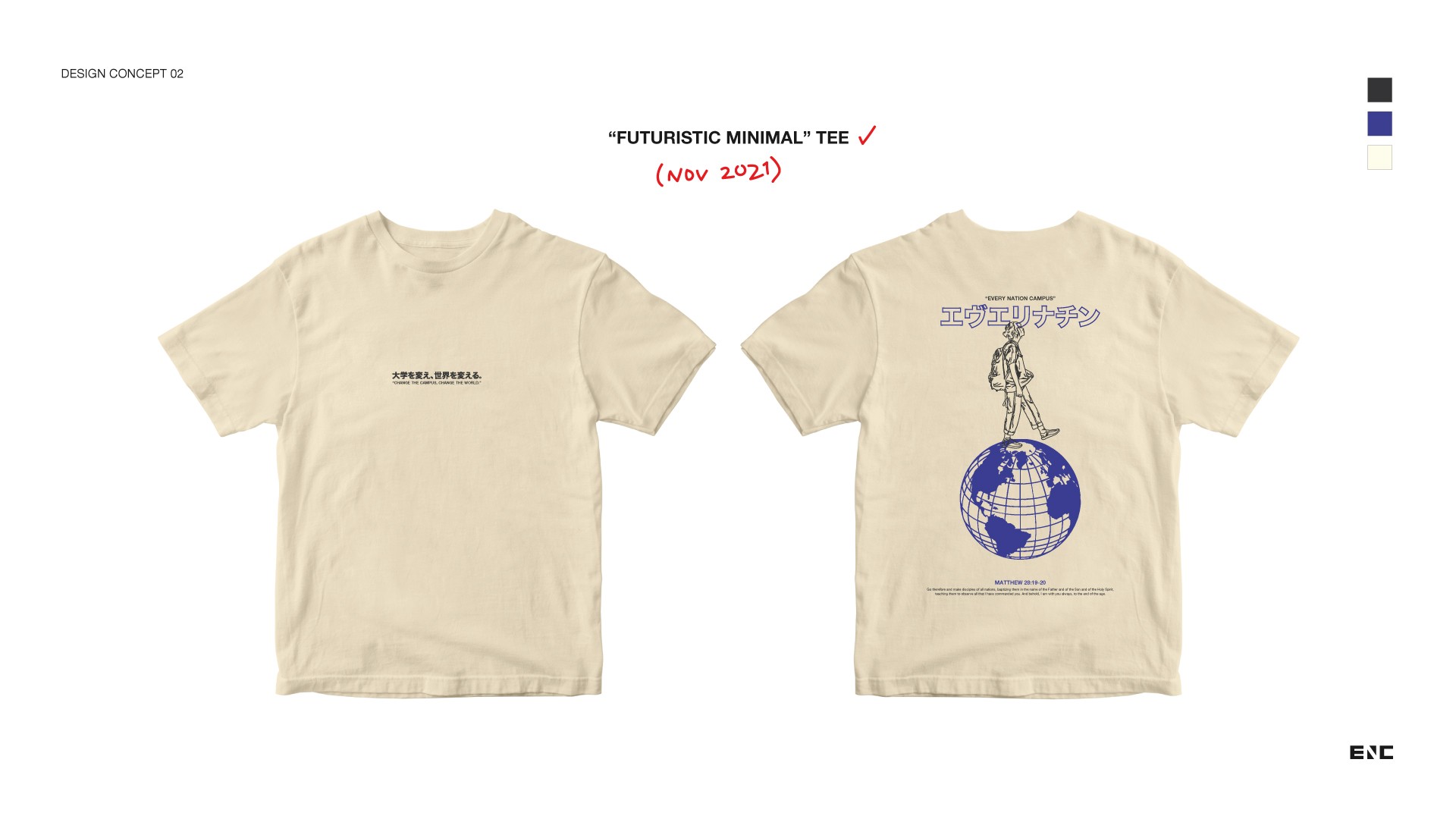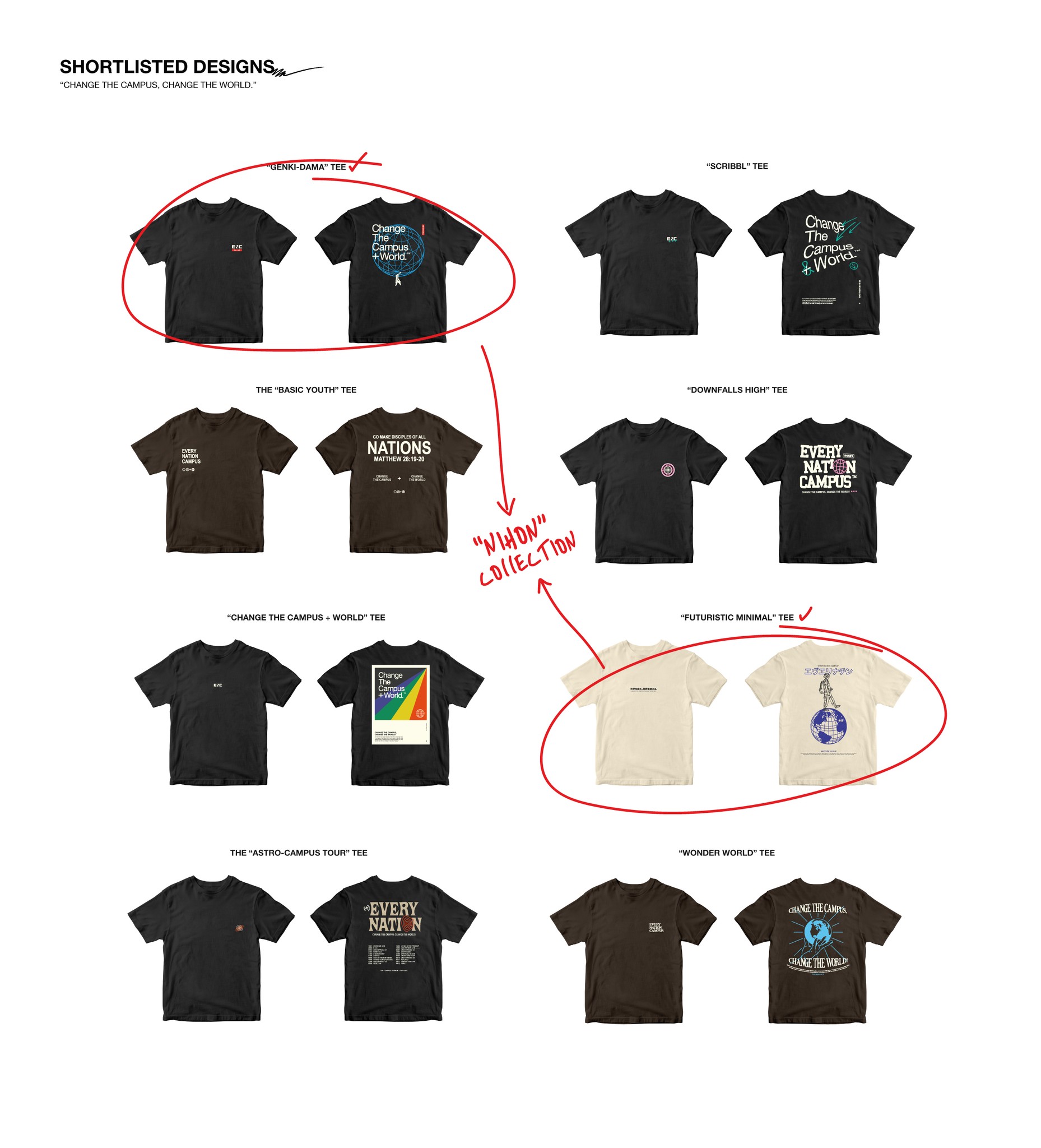 I was responsible for leading this project to create a collection of faith-statement apparel that fits the modern fashion and caters to the vast array of campus students’ fashion preferences, following the original slogan of Every Nation Campus - “change the campus, change the world.”